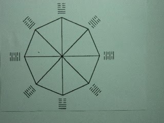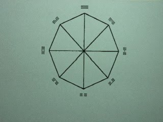 Fu Hsi gilt als legendärer Schöpfer der acht Trigramme. Er stellte allem Werden und Vergehen ein Kräfteziel aus acht polaren, sich ergänzenden Kräften zugrunde. In ihrer bildhaften Darstellung erscheinen sie als Trigramme in einer paarweisen und radialen Anordnung. Vier symmetrische Achsen schneiden sich in einem zentralen Punkt. Ein und dieselbe Achse stellt sowohl die positive als auch die negative Seite derselben Kraft dar. Die polaren Kräfte stehen sich auf der gleichen Achse gegenüber. Damit ergibt sich ein oktogonales Muster aus acht gegenüberliegenden Trigrammen, in denen die Yin- und Yang-Linien in polarer Weise ausgetauscht erscheinen (Abb. 11).
