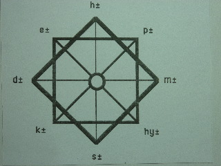Im idealtypischen Zustande des dynamischen Gleichgewichtes liegen die Kräftepaare, die polhaften Tendenzrichtungen der Faktoren, auf derselben Achse und bilden so eine Einheit. Dadurch vermeidet Szondi eine dualistische Schau des menschlichen Schicksals. Die vier symmetrischen Achsen schneiden sich in einem Mittelpunkt. Damit bildet sich ein achteckiges sternförmiges Muster (Abb. 13).