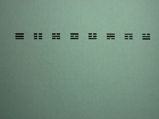 Die acht Trigramme kombinieren sich zu „Hexagrammen“, bestehend aus sechs Linien, von denen drei ungebrochen (durchgehend) und drei gebrochen (in der Mitte unterbrochen) sind. Aus diesen sechs Linien lassen sich waagerecht angeordnet 26, d.h. 64 Kombinationen bilden.